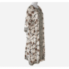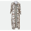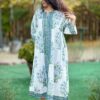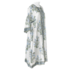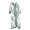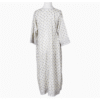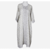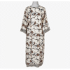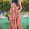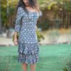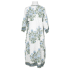 Full-length dress in soft cotton with floral block print. Round neckline with a short slit end. The dress has side gathers that add to the flare of the dress from the sides to the bottom. The upper of the side gathers is the relaxed fit ¾ length sleeve. Soft feel and cool dress for summer.