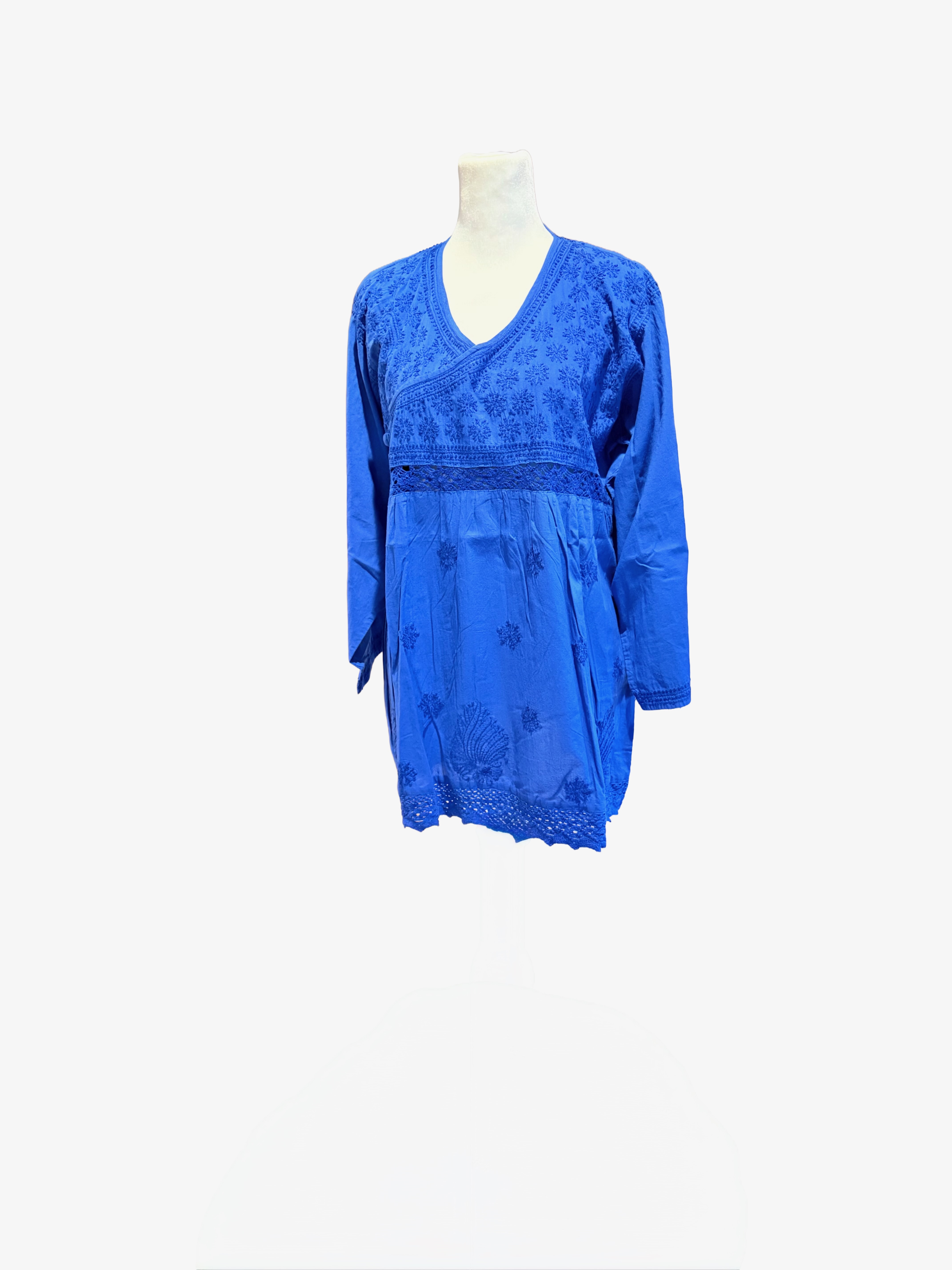 This beautifully designed top with exceptional hand embroidery truly stands out. Made of superior cotton with hand-crocheted lace on the waist and hem. Long ¾ sleeves accented with embroidery. Back is accented with an embroidered motif for a fully authentic look. Perfect choice for a petite body. Last few pieces in stock, so hurry.
