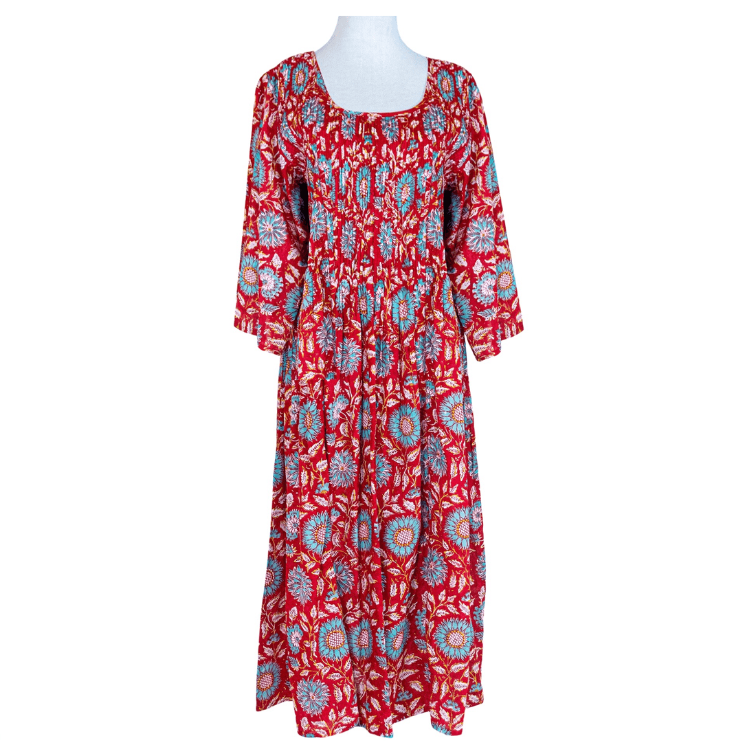Exuding timeless elegance, this ankle-grazing dress combines artisanal block print with soft, breathable cotton for effortless charm. Pintuck detailing across the bodice shapes the silhouette, cascading into a graceful flare that moves with ease. A round neckline and slightly loose ¾-length sleeves enhance its relaxed sophistication, while discreet pockets add a practical, stylish touch.