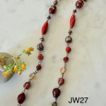 A vibrant glass-beaded necklace designed to add a pop of color and charm to any outfit. Featuring a playful mix of bead shapes—oval, round, faceted, and abstract—this piece showcases rich earthy multi color tones.