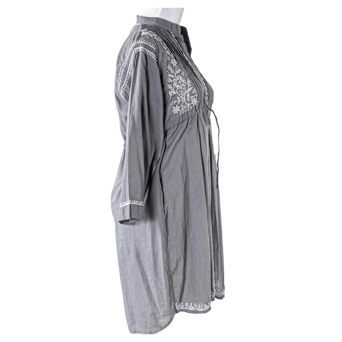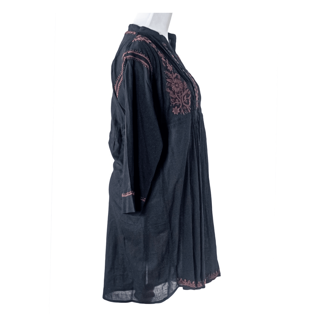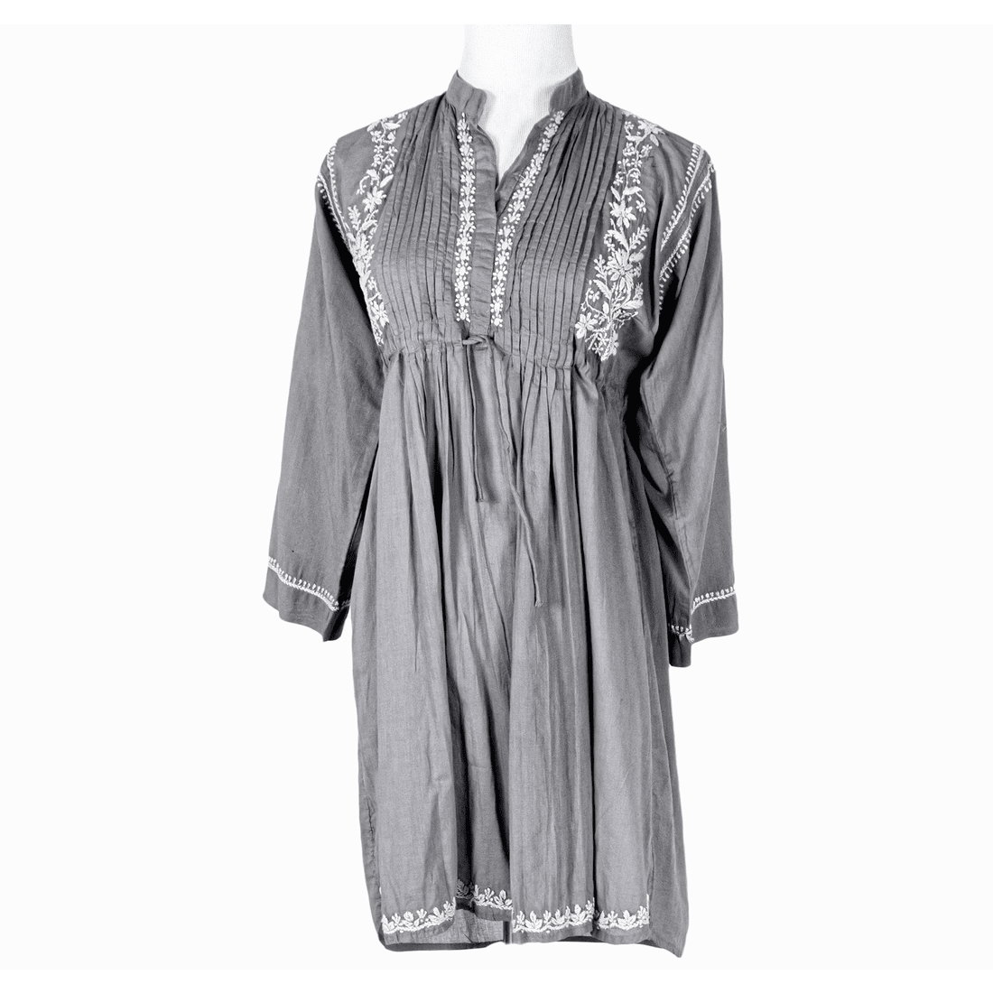 Light, airy hand-embroidered Tunic Top in superior soft-feel cotton. High collar, ¾ sleeves with folded endings, it comes with a drawstring. Tie it to enhance the couture or leave it untied for a more casual roomy top look. Back is accented with a matching embroidered motif. Wear it over leggings or skinny jeans to get that smart look.