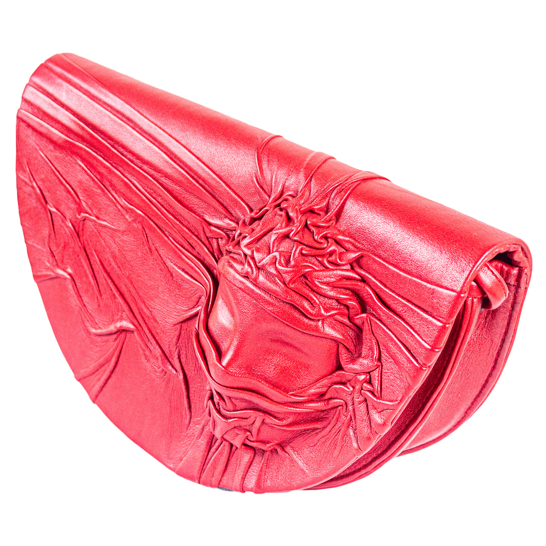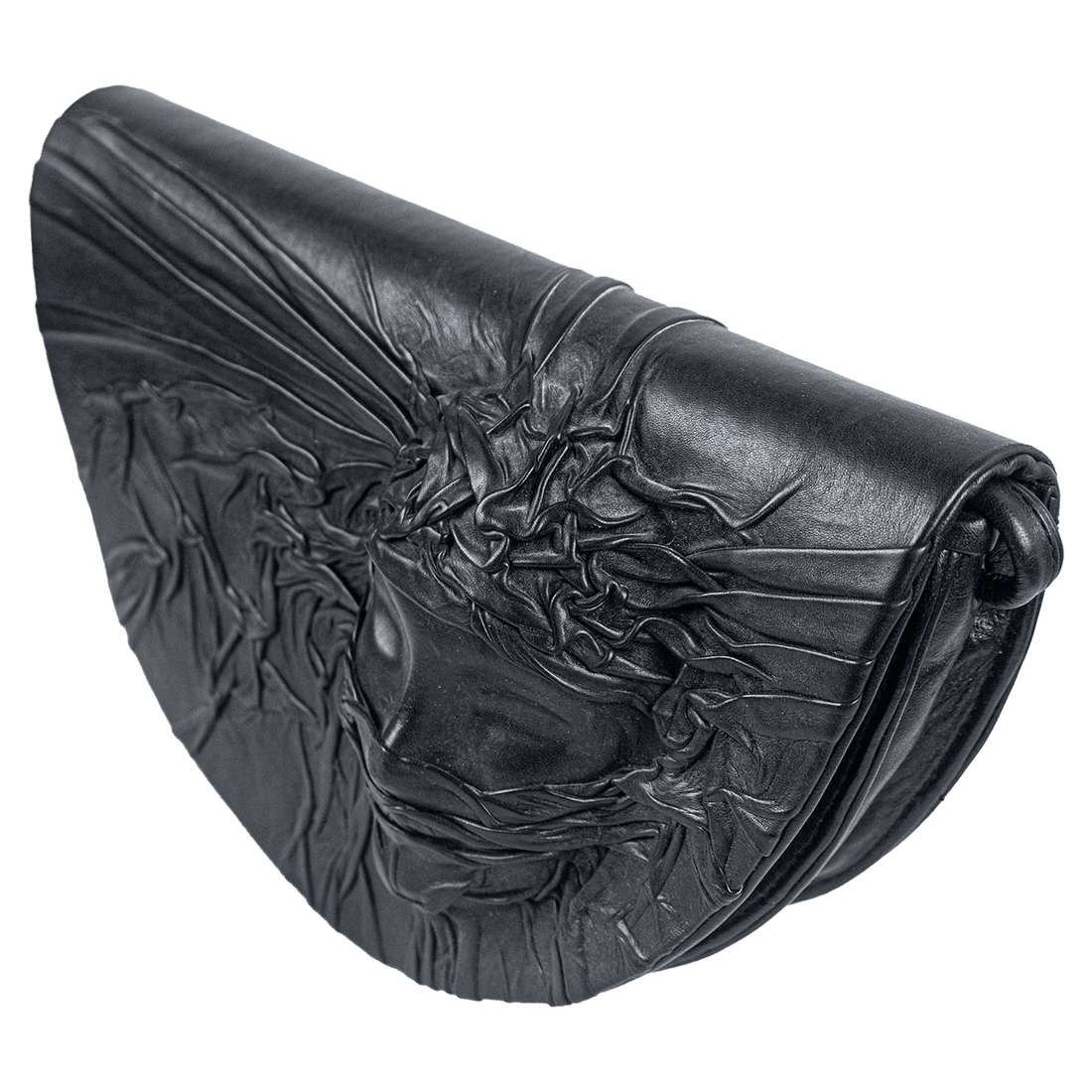 Genuine leather purse with covered face embellishment. This arty half-moon shape leather Shoulder Bag has a uniquely handcrafted woman's face on the front. Fold-over flap with magnetic closure and inner wall pocket with zipper.