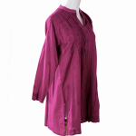 Evergreen style in comfortwear! Superior quality cotton top with front pleats and embroidery patterns. Neckline is a high collar tunic with a slit opening. It has long ¾ sleeves and side slits. Back is accented with an embroidered motif for a fully authentic look.