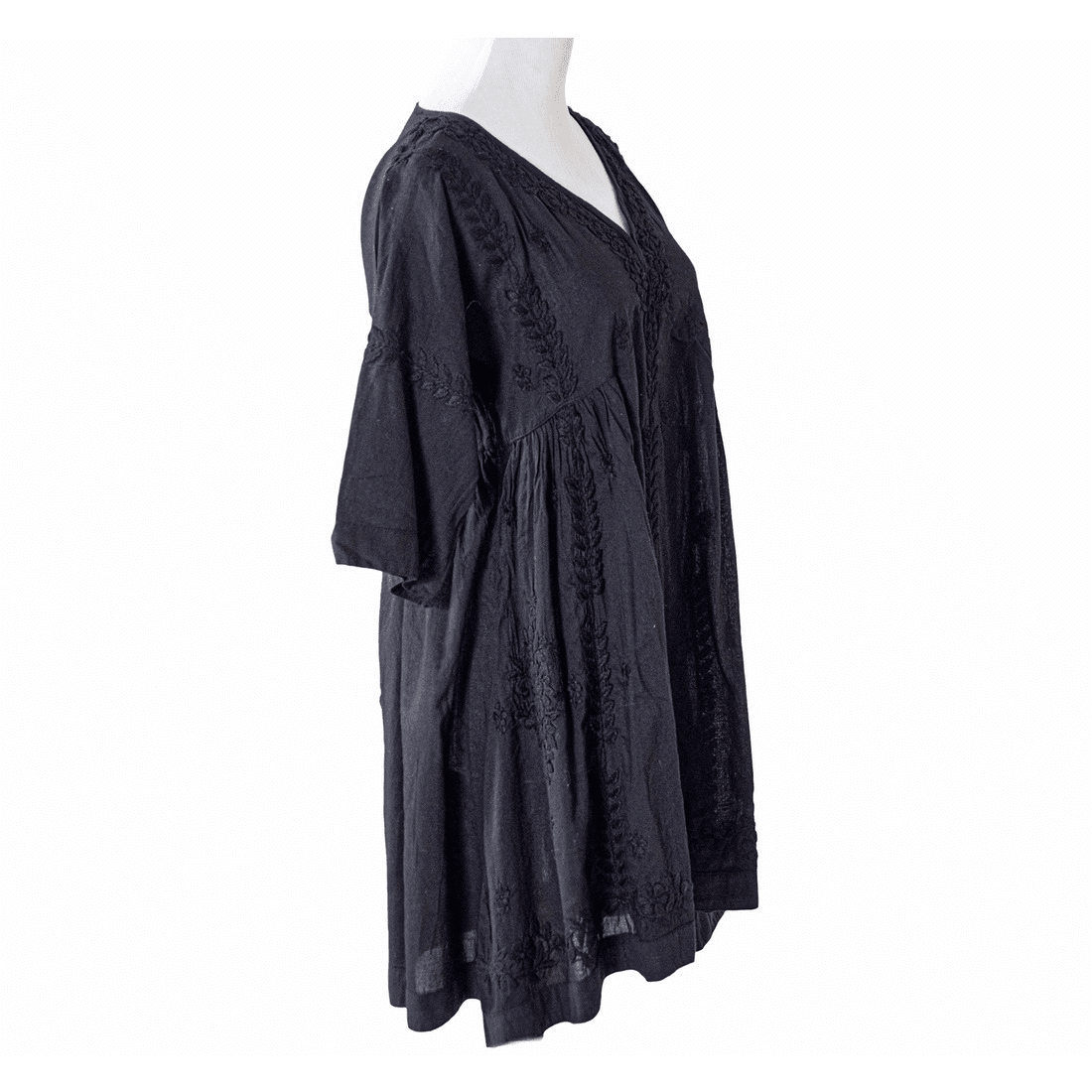Our bestseller! Soft feel, airy, superior cotton with exceptional hand embroidery in the front, dress. it has a slight plunged V- Neckline and raglan sleeves that end just over the elbow. Side gathers give it a roomy flare. Wear it as a top or a dress to impress.