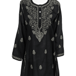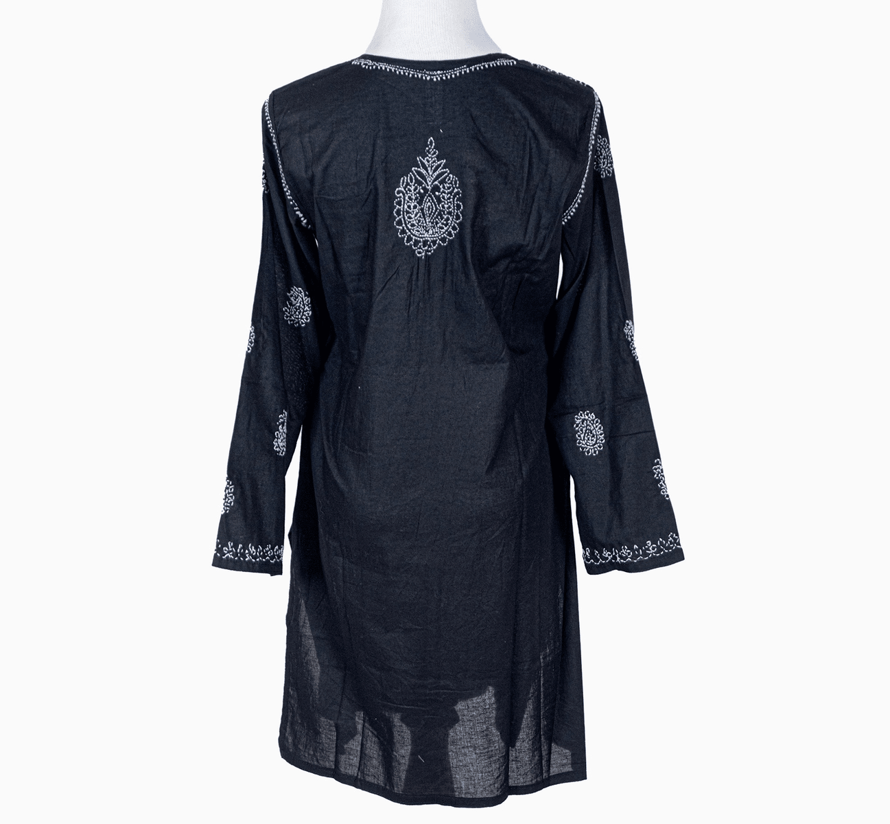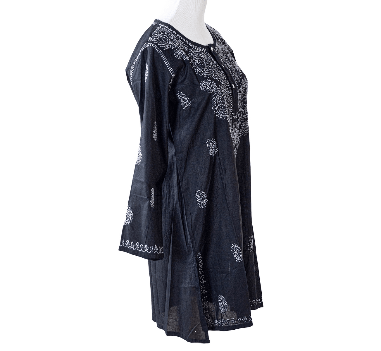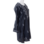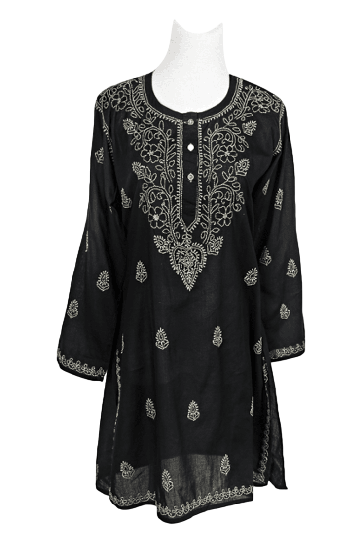 Light and airy Tunic Top in superior soft-feel cotton with hand embroidery. This simple kurta-style Tunic has all-over embroidery on the front and an embroidered motif on the back for an elegant looK. Round neckline with accent front buttons, it has ¾ sleeves and side slits. Wear it over jeans for a very casual look.