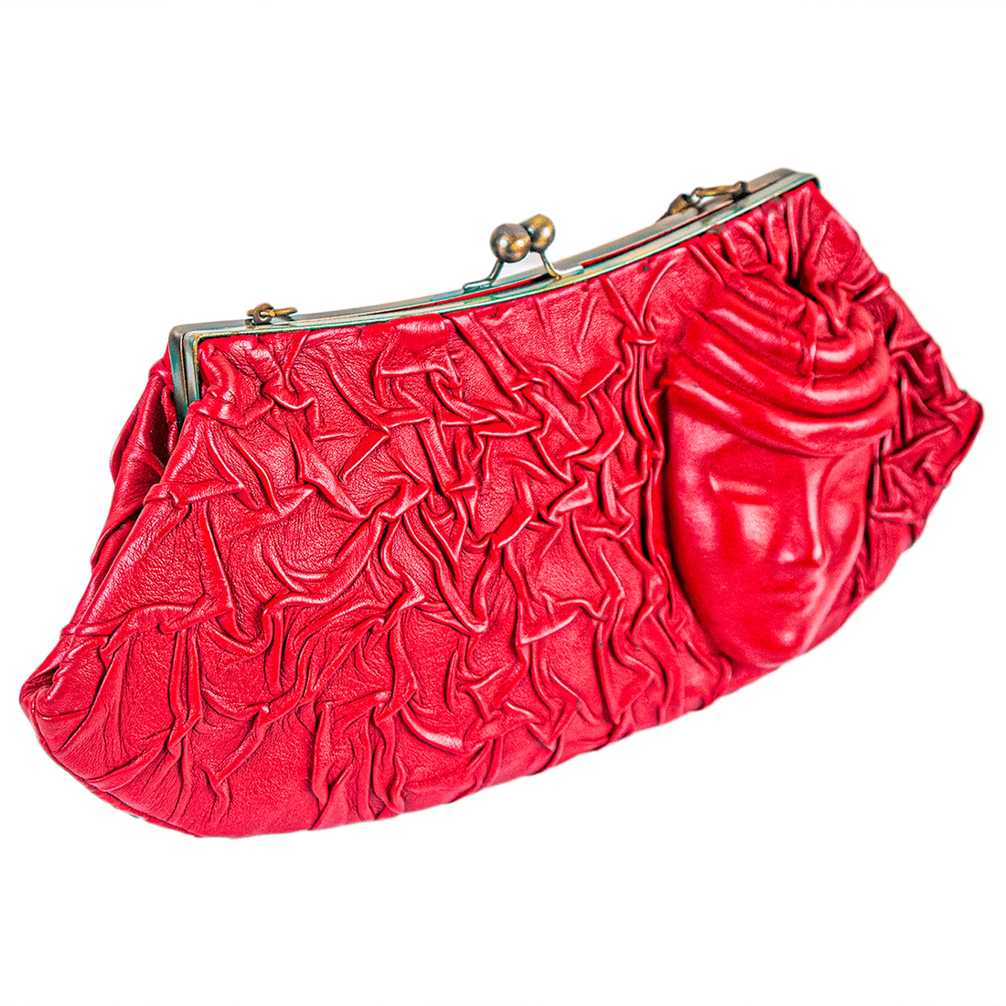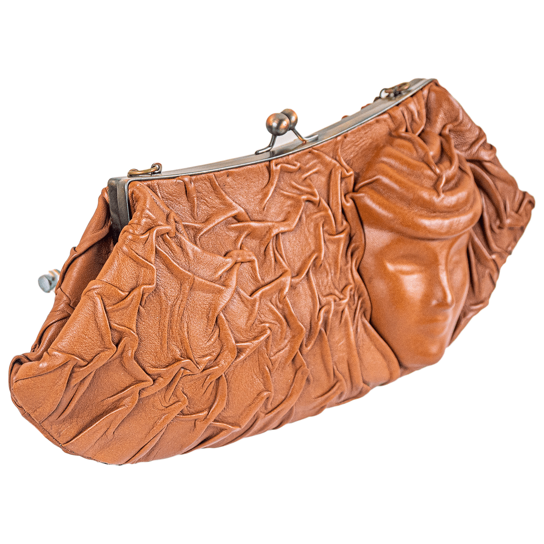 Genunine leather clutch purse with face embellishment. This arty leather Clutch Bag has a uniquely handcrafted woman's face on the front. The bag comes with a beautiful brass shoulder strap of 16"" drop which can be inserted inside for a hand clutch. Inside satin lining and a wall zipper pocket. Back side with crinkled texture of leather.