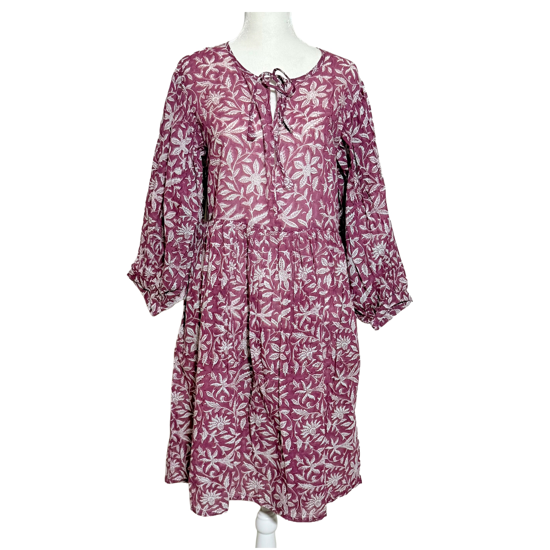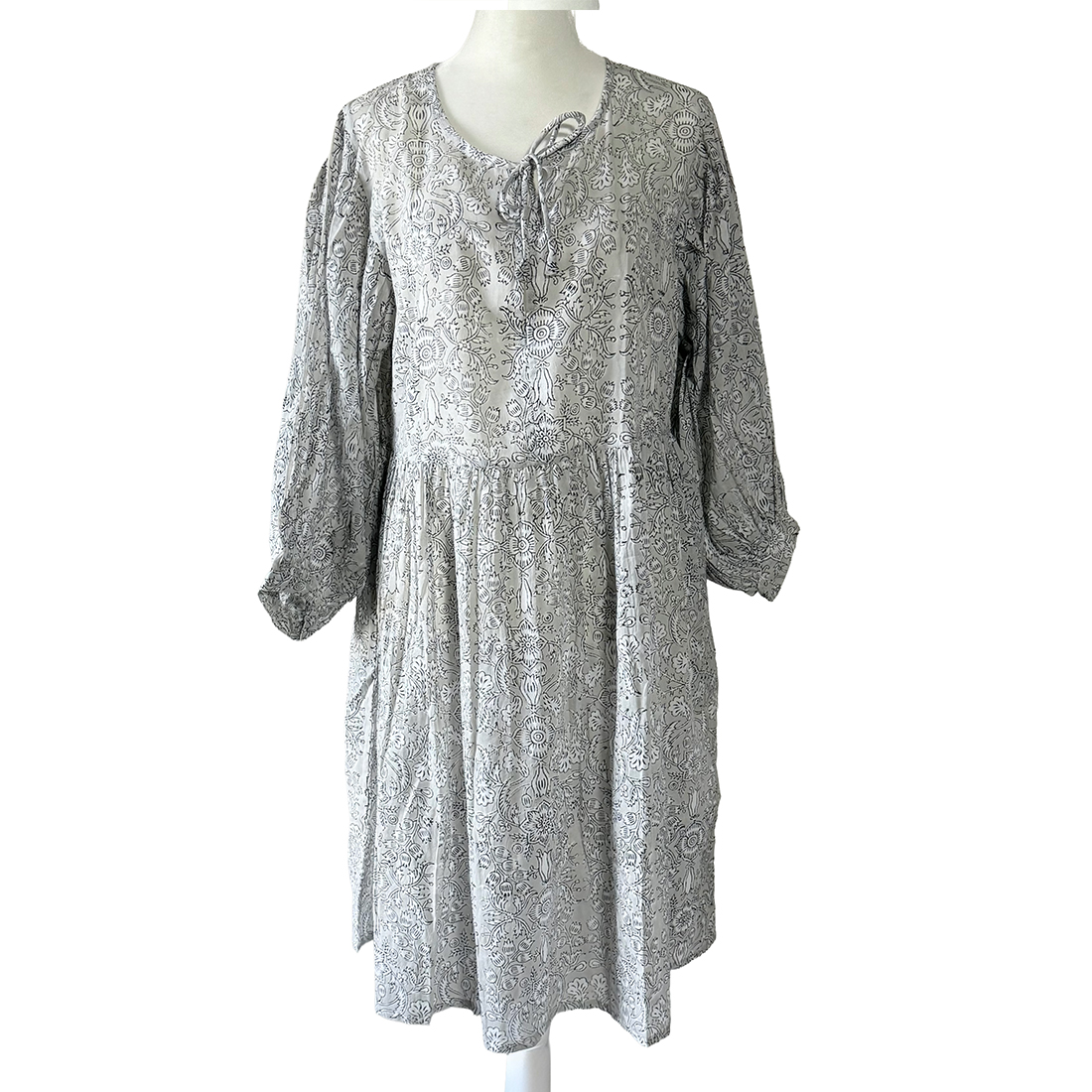 Softly romantic and effortlessly graceful, the Silver Meadow Block-Print Dress embodies timeless boho elegance. Handcrafted in airy cotton with a delicate floral block print, it drapes beautifully with a relaxed, flowy silhouette that moves with quiet charm. The tie-front neckline and gently gathered waist add a touch of femininity, while the billowed sleeves lend an artisanal, vintage-inspired finish.