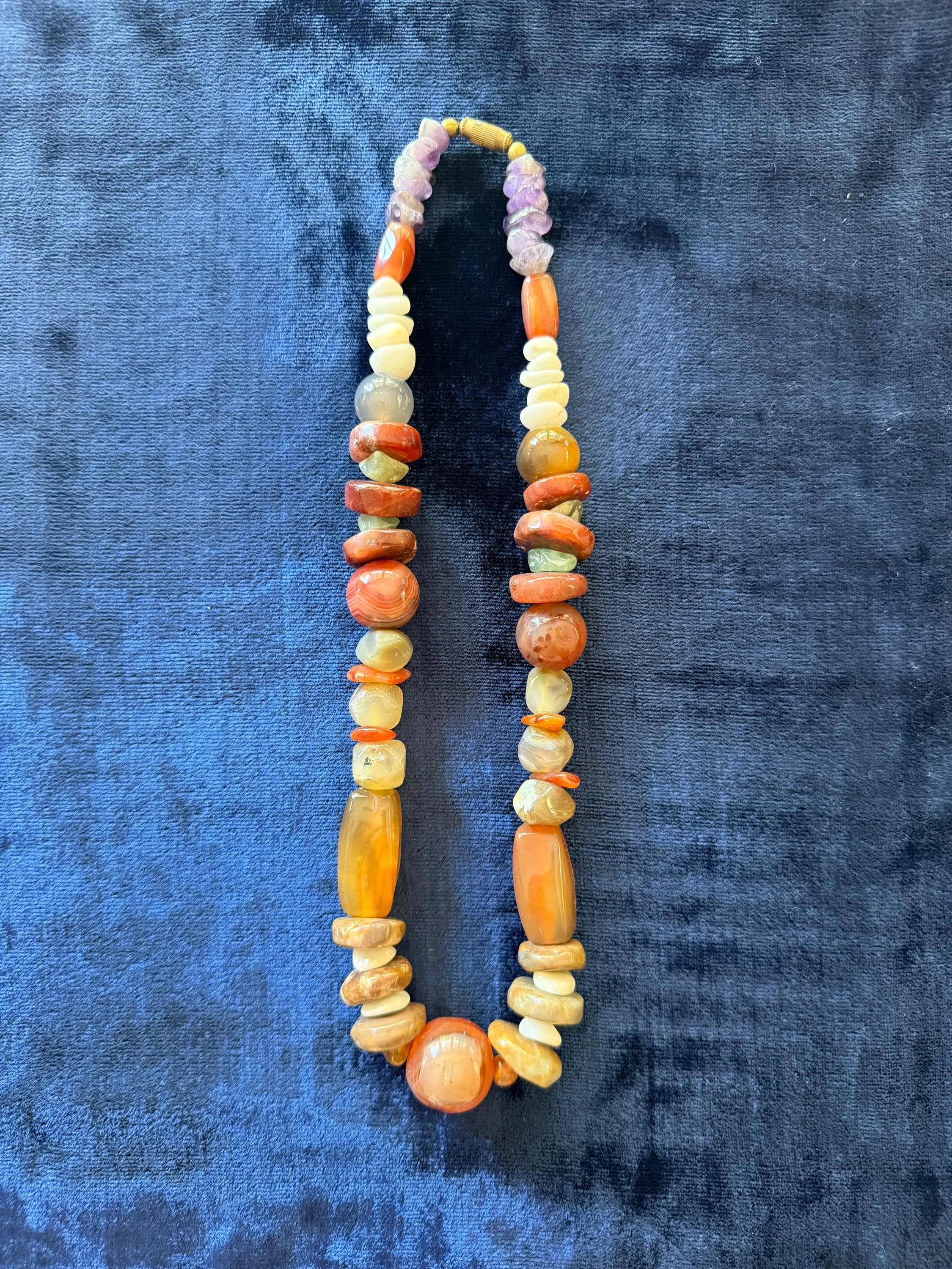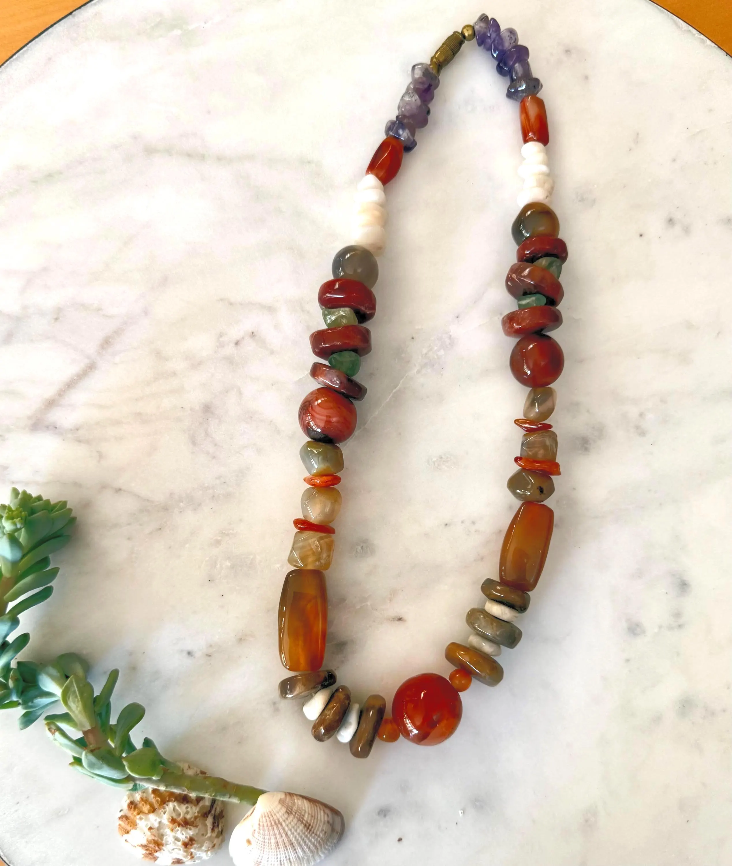 Add a touch of natural beauty to your jewelry collection with this stunning multi-colored necklace. Handcrafted with a mix of semi-precious stones in warm, earthy tones, each bead is carefully cut into various smooth shapes. The variation in form and color creates a refined yet organic look that feels both timeless and unique.