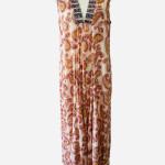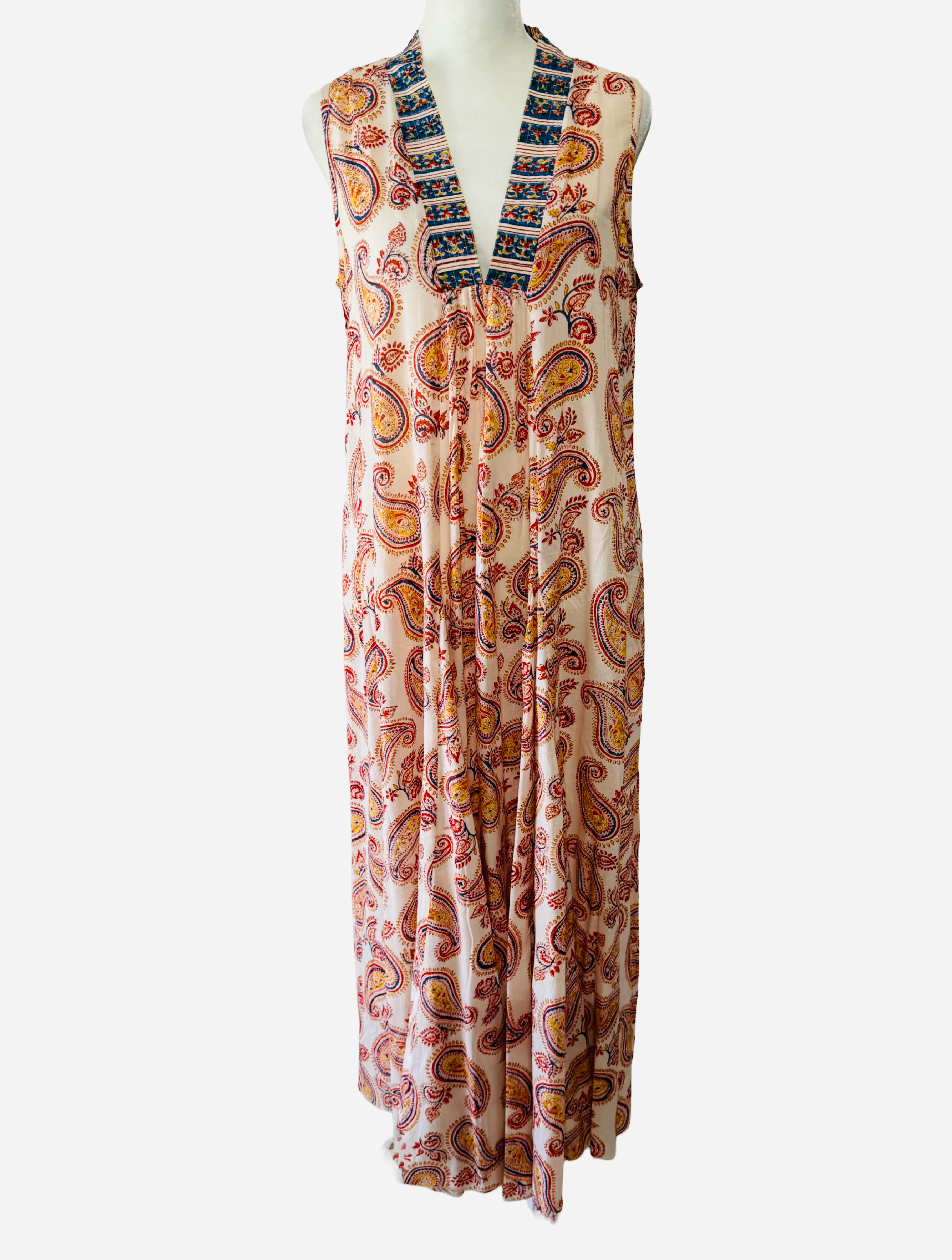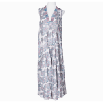 Effortless elegance meets breezy comfort in this full-length cotton dress. Soft, breathable fabric showcases a vibrant print, while a deep 11” broad-band V-neckline with delicate running stitch adds subtle refinement. The sleeveless A-line silhouette flares gracefully below the neckline, creating movement and a flattering, elongated effect. Perfect for warm-weather sophistication, this versatile piece transitions beautifully from casual days to evening outings.