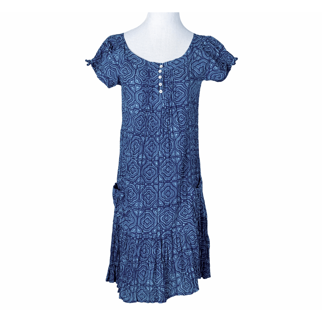 This charming midi dress is crafted from lightweight cotton, featuring two practical front pockets for added convenience. The short puffed sleeves are gently smocked with elastic, offering a flattering fit for all body types. A broad round neck with five accent buttons and pintuck detailing near the buttons add a touch of sophistication. The dress is fitted at the top and flares out beautifully at the bottom, with a 9" frilled hem for a playful finish.