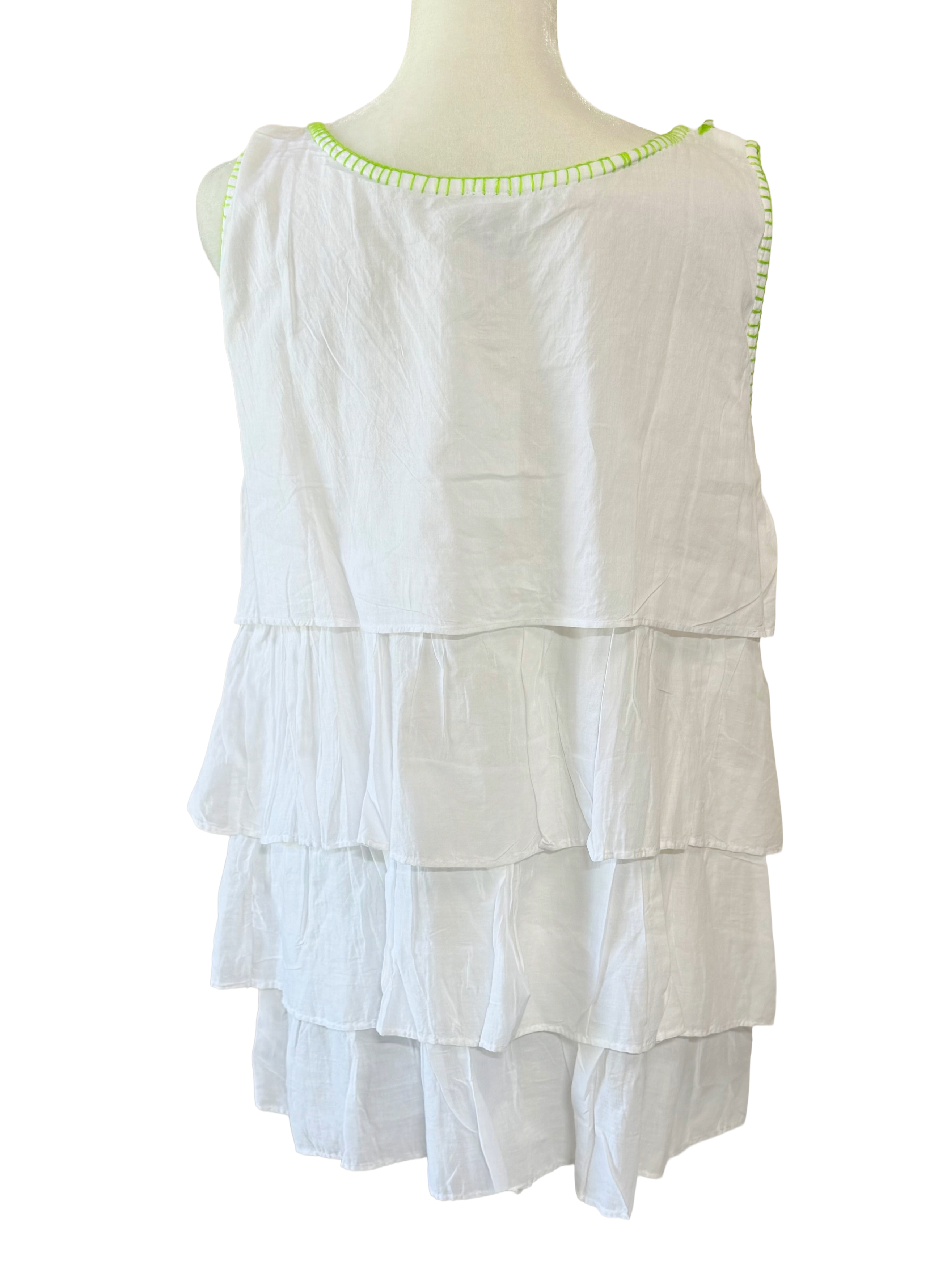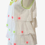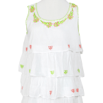 Light, airy, in breathable superior cotton, soft feeling with hand embroidery. Tiered in three layers of embroidered long ruffles with blanket stitch edging makes it a fun top to wear for all ages.