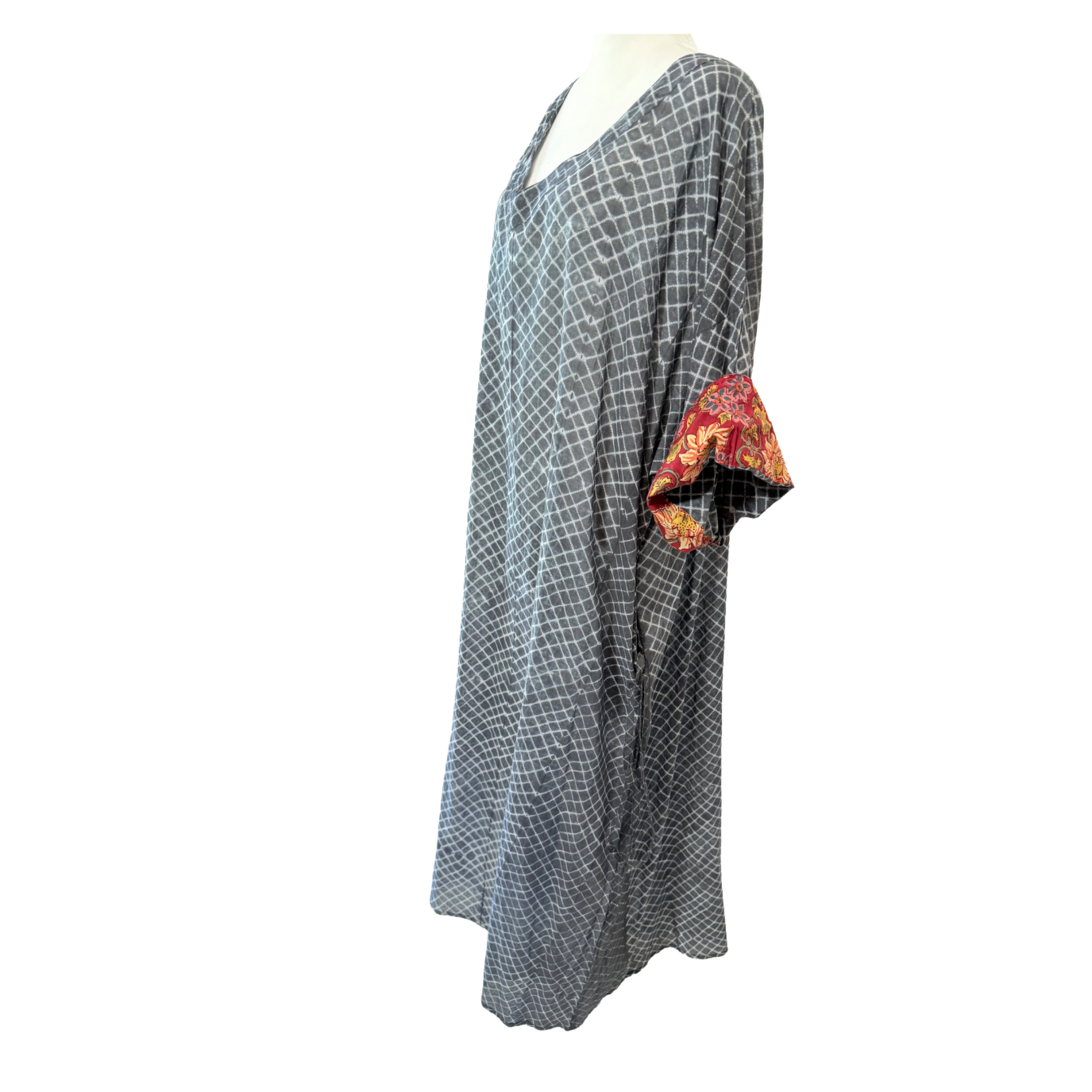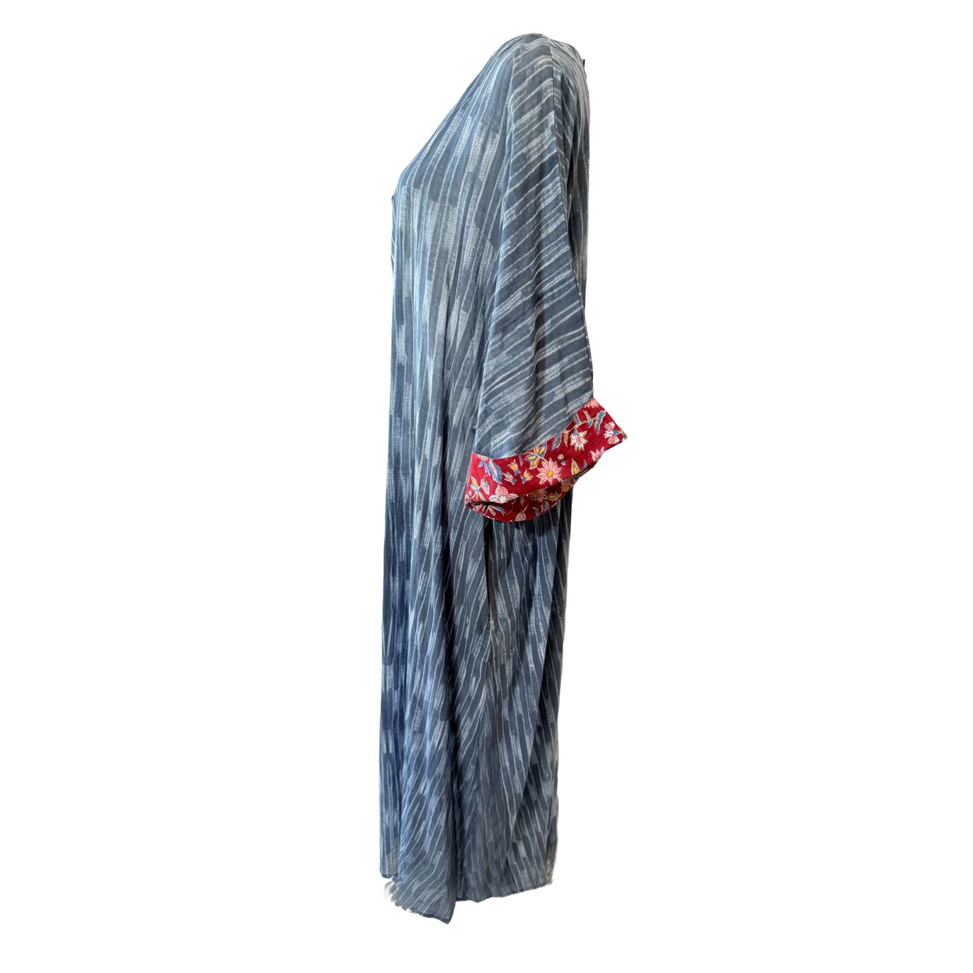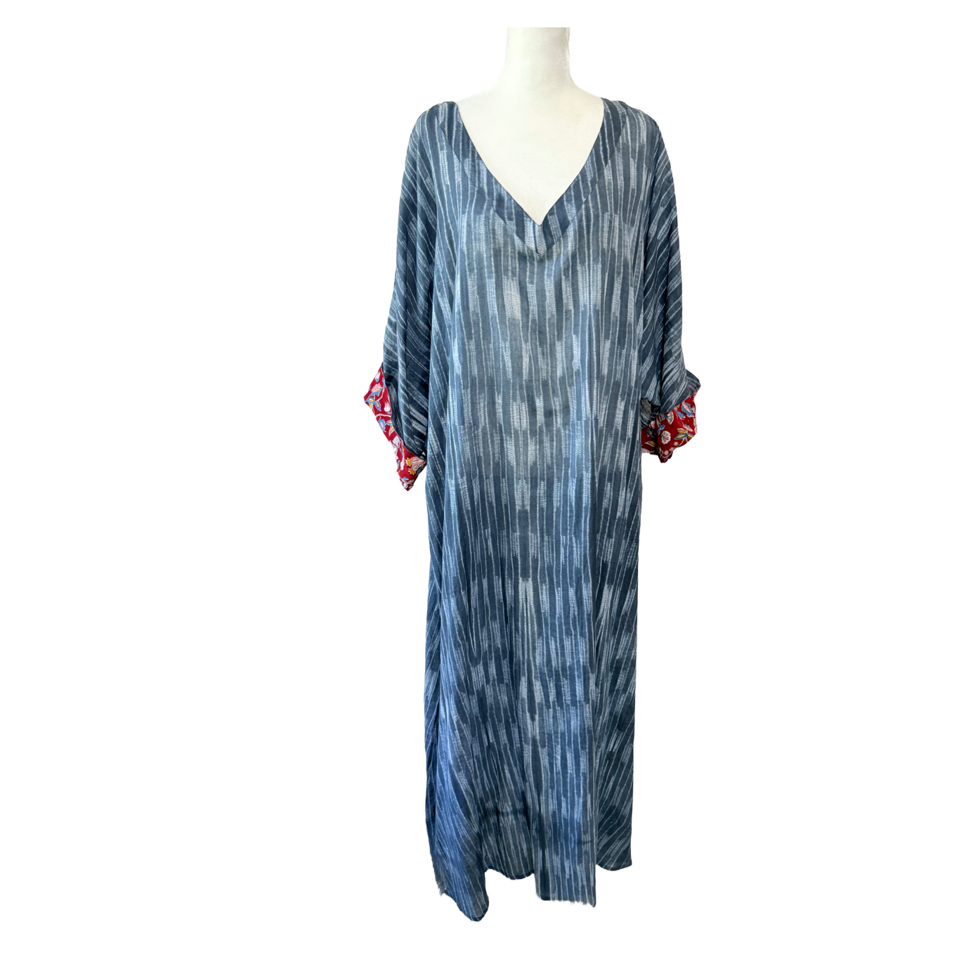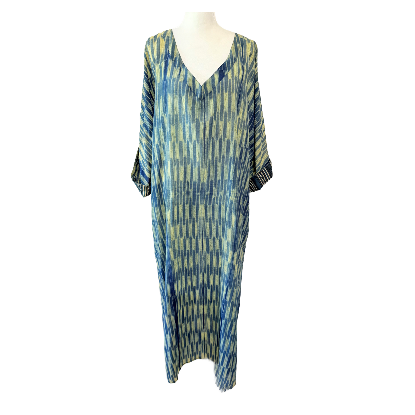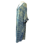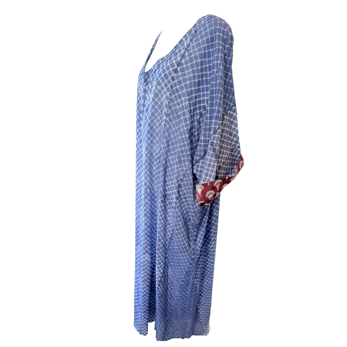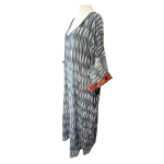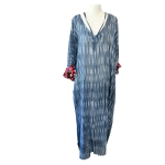 A full-length kaftan in hand block Shibori print accented with a contrast color print border on the sleeves. The front neckline is a deep V with a drawstring waistline to adjust the shape for all body types. This is a breezy cotton kaftan with side pockets! A kaftan for beach, resort, vacation, cruise, pool, home parties, and or lounge this kaftan is a step higher from casual wear to upper casual wear.