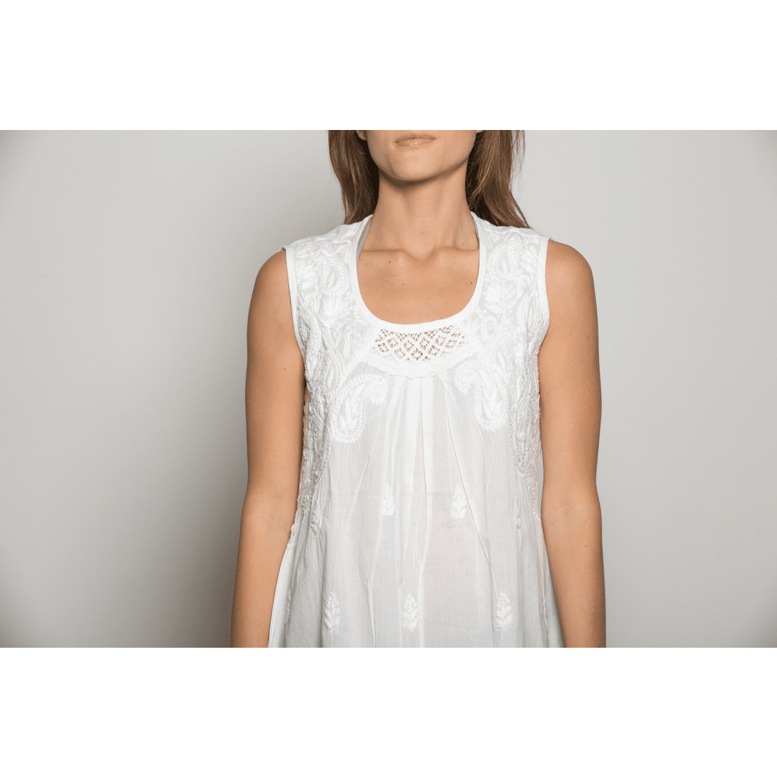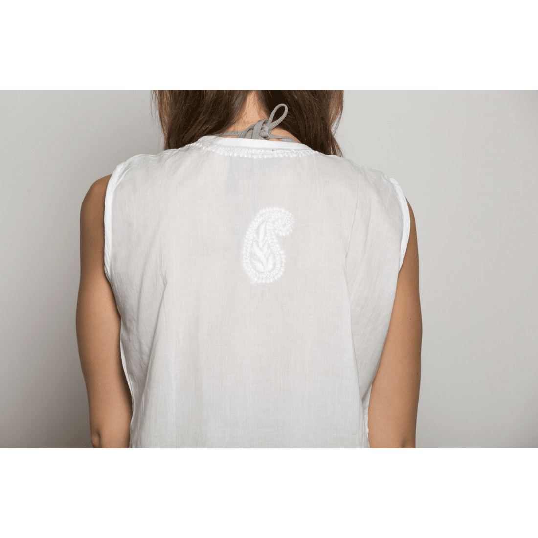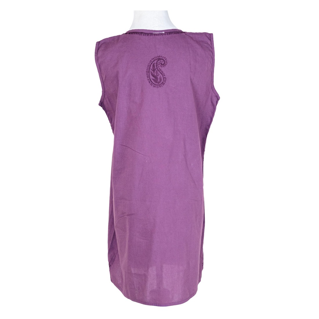 Beautiful hand-embroidered tunic in superior cotton. The tunic is sleeveless with no side slits. Accented with a small crochet front the tunic looks and feels very different and elegant. Back is accented with an embroidered motif for a fully authentic look. You can pair it easily with leggings or shorts.