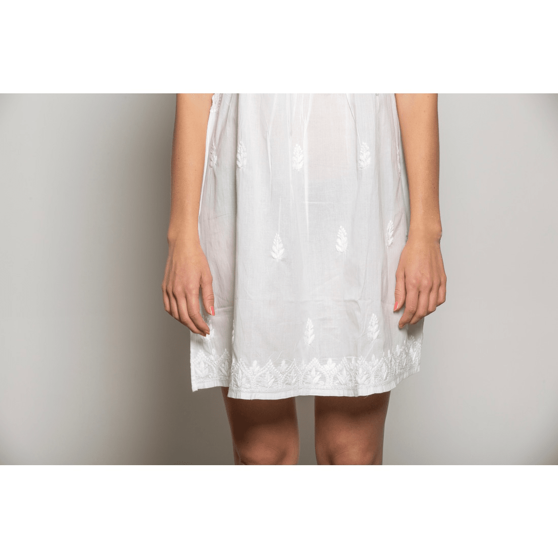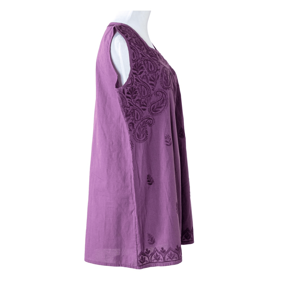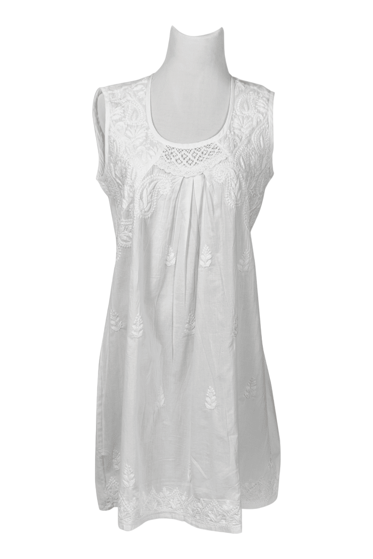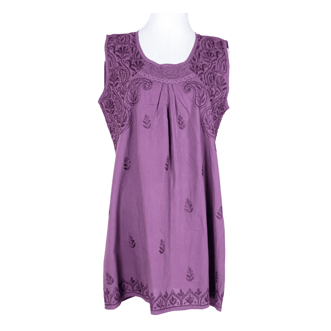 Beautiful hand-embroidered tunic in superior cotton. The tunic is sleeveless with no side slits. Accented with a small crochet front the tunic looks and feels very different and elegant. Back is accented with an embroidered motif for a fully authentic look. You can pair it easily with leggings or shorts.