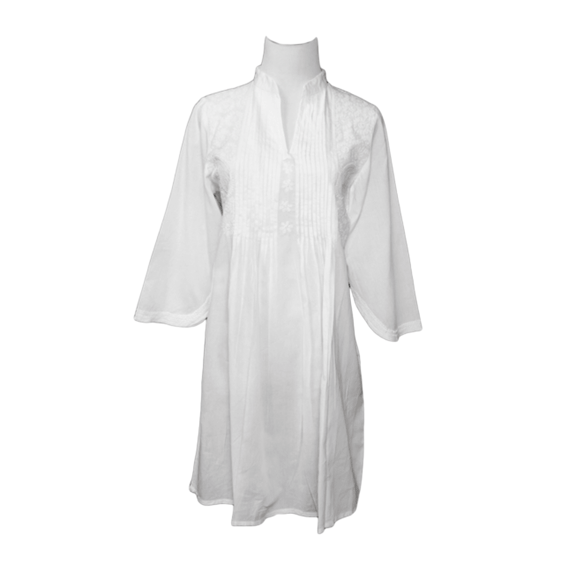Light and airy Tunic Top in superior soft-feel cotton with hand embroidery. . High collar neck with a slit. Pleated front with embroidered sides and tulip sleeves makes it a classy style. Back is accented with a matching embroidered motif. The tunic easily slides over the head making it a versatile use as a tunic top, or an elegant swim cover-up or wear it belted as a mini.