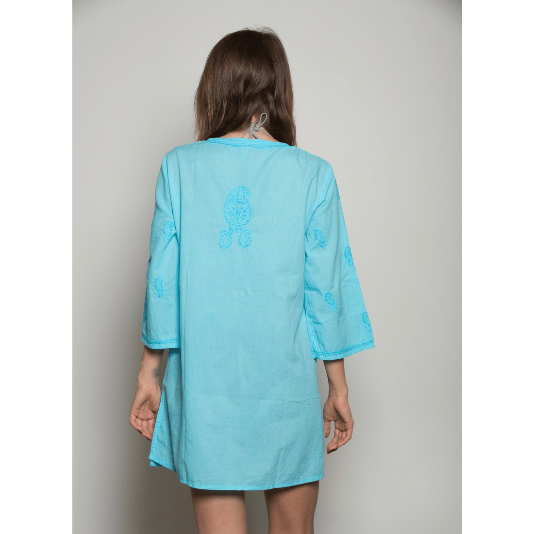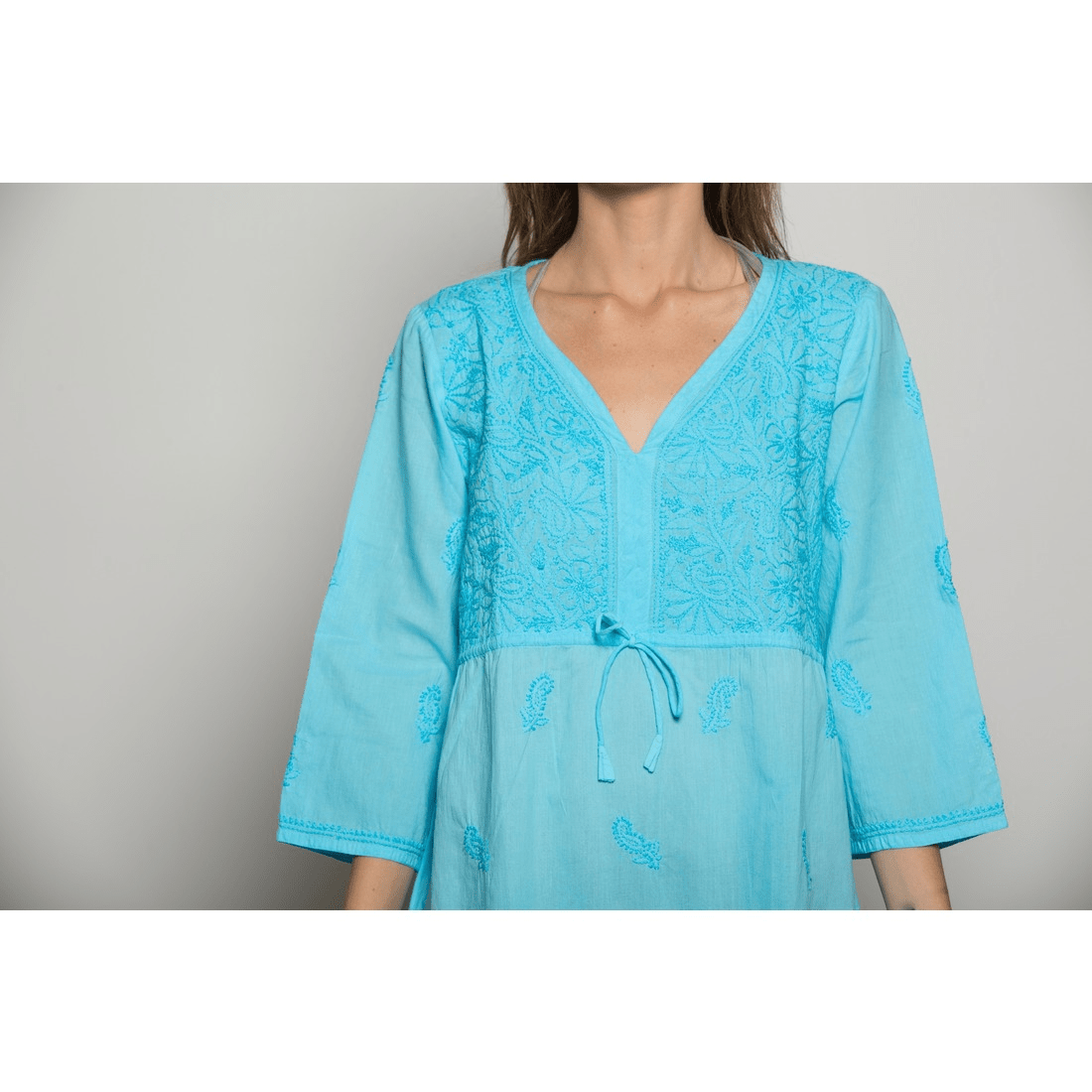 Soft, comfortable in breathable cotton with heavy embroidery on the front yoke and bottom. Addition of a drawstring for added size contour. Leave it untied for a loose-fitting. V-shape neckline. Can be worn over as a cover-up or a top.