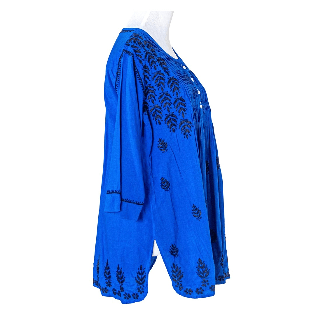 Soft feel, airy, and comfortable top with beautiful hand embroidery that stands out in neatness and density. Front twisted pleats give plenty of room to the flare of the Tunic Top. Round neckline with half-way buttons, ¾ length sleeves, and breezy side slits. Embroidered border in front and back bottom part. Back is accented with a matching embroidered motif.